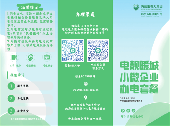供电服务关系千行百业,连着千家万户。一直以来,鄂尔多斯供电公司坚持以人民为中心的发展思想,践行人民电业为人民的企业宗旨,本次最新推出的“电靓暖城 小微企业办电套餐”与“晶硅光伏企业办电套餐”便是该公司始终以客户需求为导向,不断创新工作机制,优化电力营商环境、提升供电服务品质的重要举措。